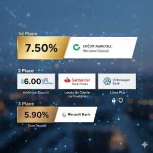 The second tier of the ranking saw three different deposits offering a solid 6% annual interest rate. Citi Handlowy’s Additional Deposit, part of a promotion for its Citigold account, maintained its strong position despite a slight reduction from its previous 6.40% rate. This offer, available for new Citigold Private Client account holders, accepts deposits from PLN 20,000 up to a substantial PLN 2,200,000.